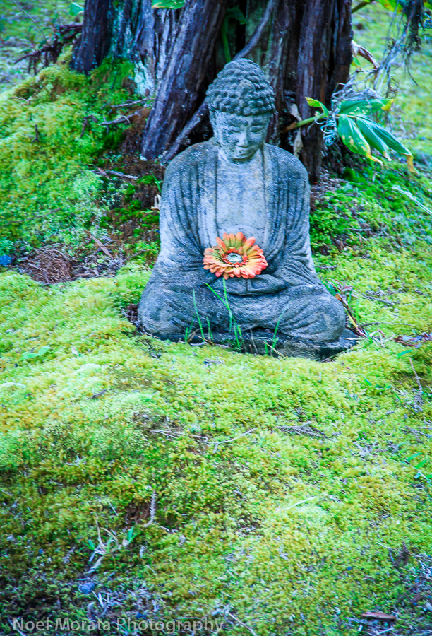 Close to the entry of the zen garden sits a small Buddha . I love when the bromeliad plants and buddha are almost buried in weeds and overgrown areas, like something neglected and disappearing back into nature and adding a nice old patina to this section.